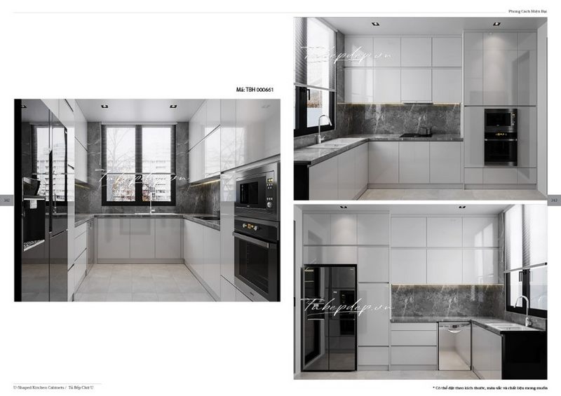 Tủ bếp gỗ công nghiệp acrylic màu trắng sáng bóng kết hợp đá ốp xám vân mây thời thượng hòa hảo cho những gia chủ yêu thích sự hiện đại.