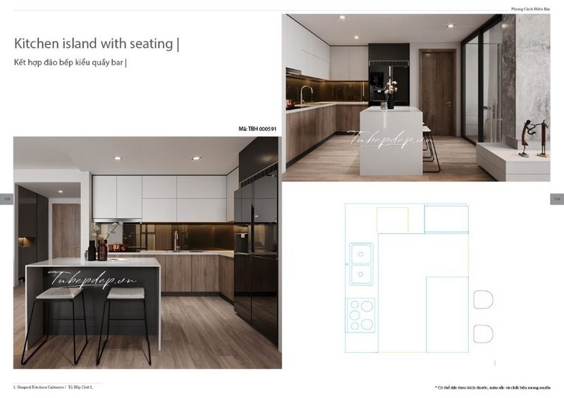 Mẫu thiết kế nội thất phòng bếp chung cư đẹp tiện nghi với đồ nội thất gỗ hiện đại cao cấp và tận dụng tối đa ánh sáng tự nhiên