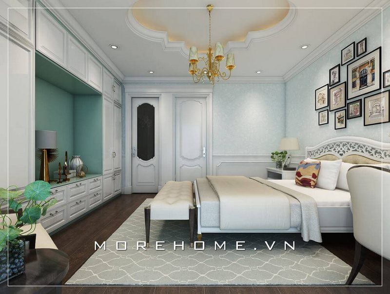Trang trí nội thất phòng ngủ Master phong cách tân cổ điển đầy sang trọng, nội thất gỗ tự nhiên màu trắng ấn tượng kết hợp sàn gỗ màu nâu trầm tạo cảm giác ấm áp cho không gian nghỉ ngơi của gia chủ