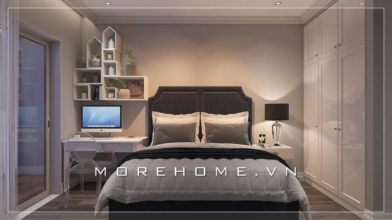 Mẫu thiết kế phòng ngủ chung cư nhỏ hiện đại, tủ quần áo âm tường, giường ngủ tích hợp với ngăn kéo phía dưới tạo thêm nhiều không gian lưu trữ đồ dùng cá nhân của mình