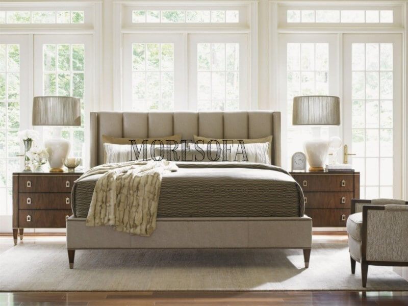 Mẫu giường ngủ bọc da tân cổ điển với đường cong uốn lượn trên thành giường sang trọng là điểm nhấn nổi bật cho căn phòng