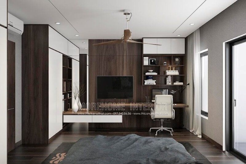 Thiết kế nội thất phòng ngủ master có tủ, kệ đựng đồ đẹp, độc đáo với nhiều ngăn đựng và ô đựng hở.