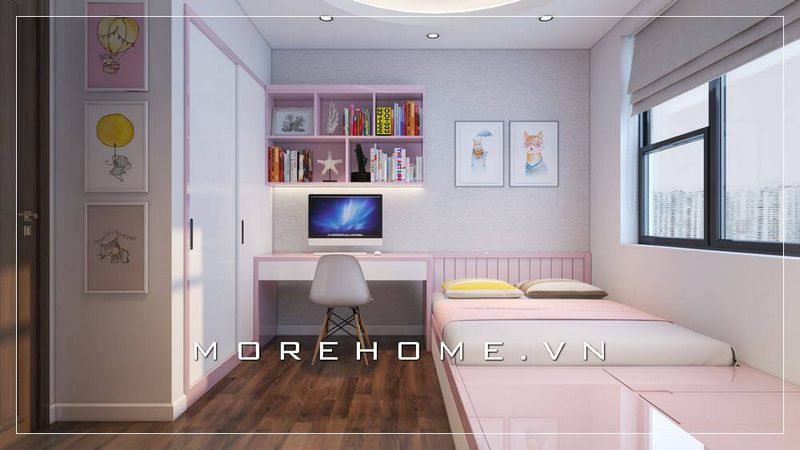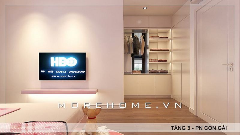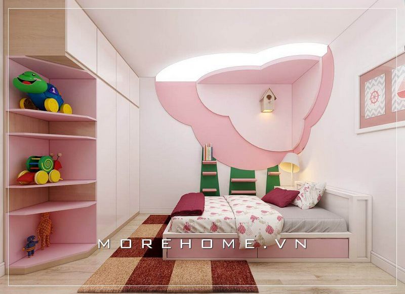 Thiết kế kệ tủ áo bé gái phong cách hiện đại, trẻ trung kết hợp kệ tủ trang trí đa năng tiện dụng