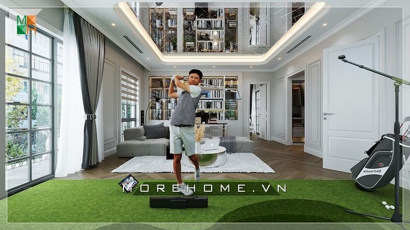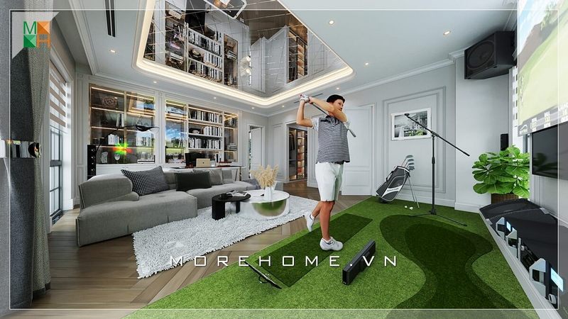 Nội thất phòng khách được thiết kế độc đáo thoáng đãng với điểm nhấn là sofa vải êm ái mới lạ cùng sân golf nhỏ là lựa chọn hoàn hảo cho căn hộ chung cư thông tầng.