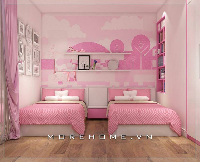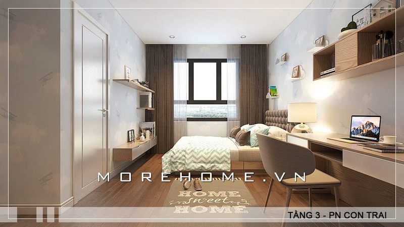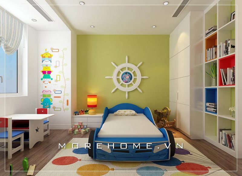 Mẫu kệ tủ treo tường được thiết kế một cách thông minh, tích hợp của nhiều chức năng như: kệ trang trí, giá sách, decor... cho không gian phòng ngủ của con