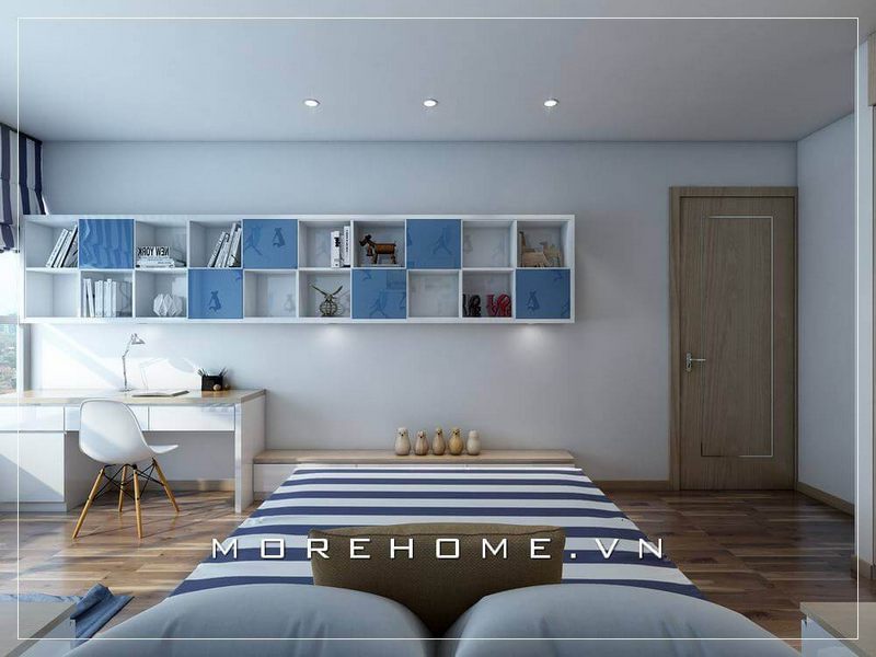 Mẫu kệ sách treo tường tường được thiết kế với nhiều ô giúp cho việc học tập và trang trí tạo không gian rộng, thoải mái hơn cho phòng ngủ của con