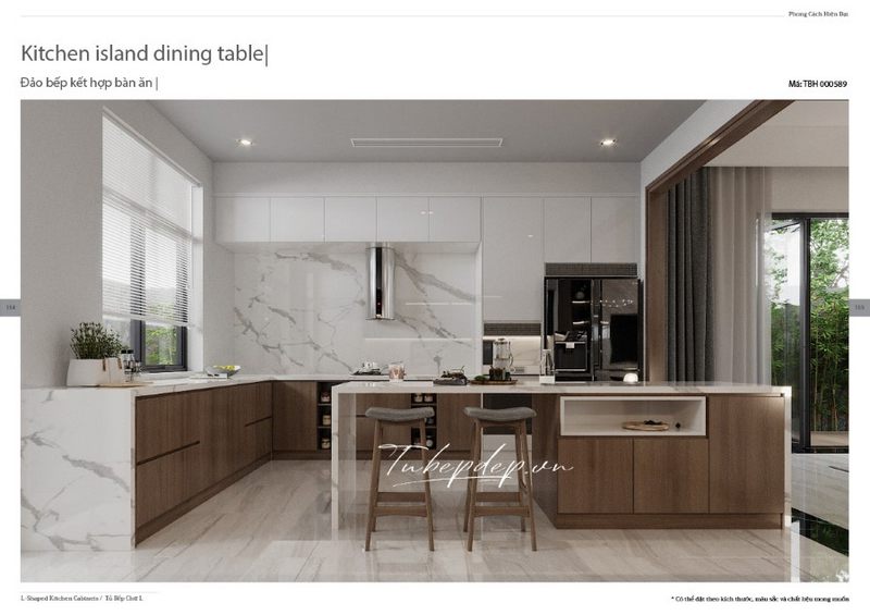 Mẫu thiết kế phòng bếp mang đậm phong cách hiện đại trẻ trung sử dụng nhiều đá trắng vân mây để ốp bàn, tường bếp. Bàn đảo cũng là điểm nhấn thú vị mà gia chủ không nên bỏ lỡ