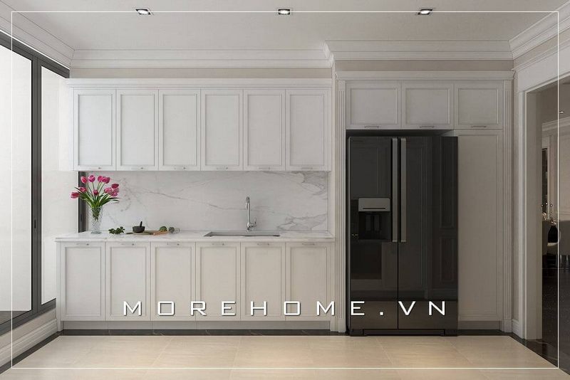 Sử dụng tone màu trắng tinh tế để thiết kế nội thất phòng bếp chung cư sang trọng và thoải mái cho người nội trợ.